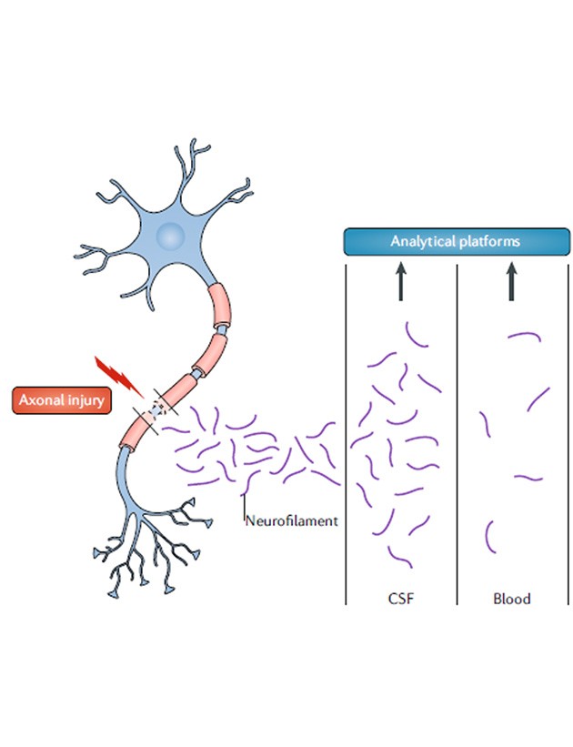 Los neurofilamentos se liberan en el líquido cefalorraquídeo (LCR) y la sangre cuando las neuronas están dañadas. Los científicos están trabajando en crear herramientas (ensayos) cada vez más precisas para medir los neurofilamentos en la sangre.6